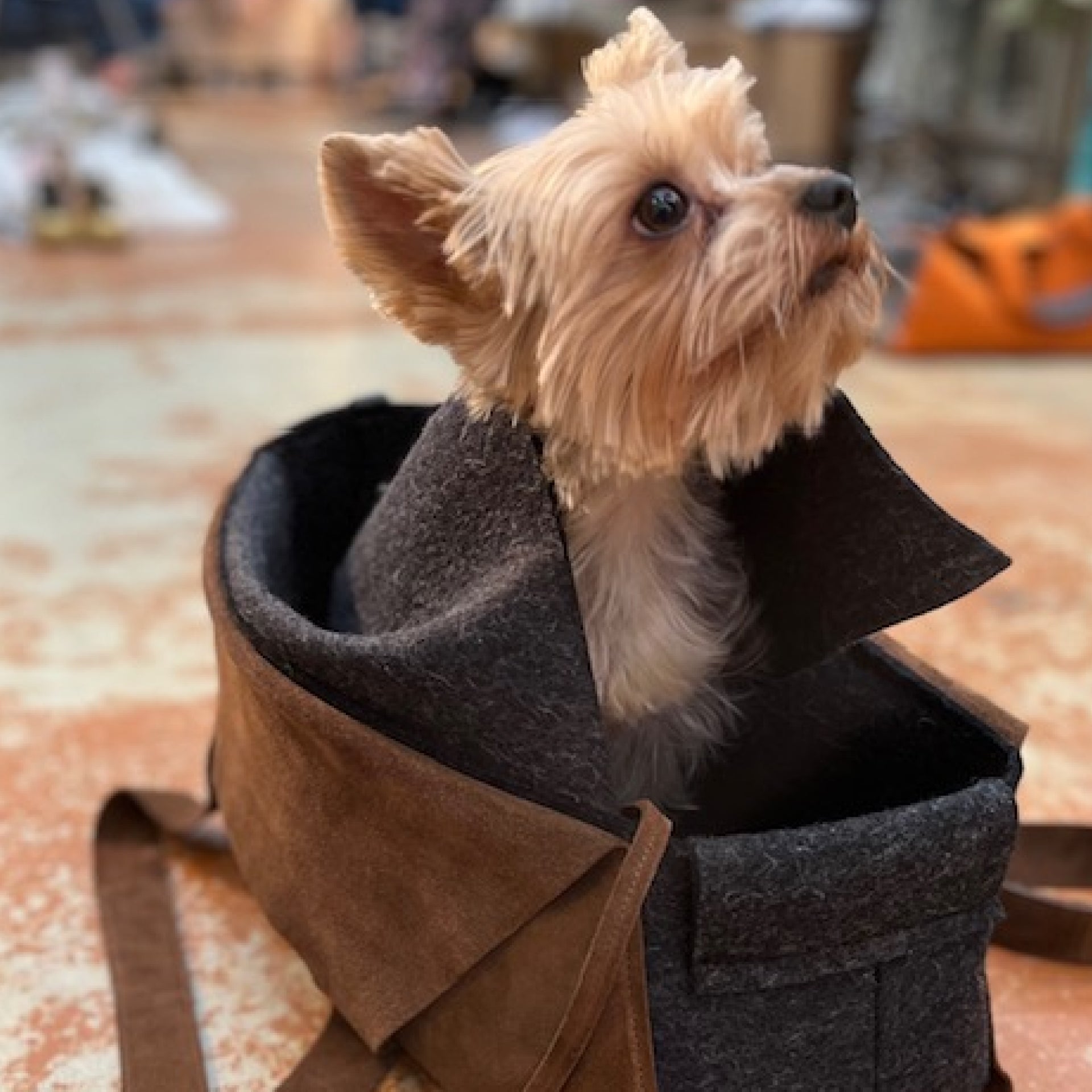 PEGGIE est un sac pour petit chien inspiré des années 70 : tendance, souple et ultra-léger. Fabriqué à la main en région parisienne, ce sac transport de chien en cuir et feutre de laine associe style rétro et confort.